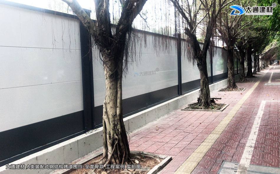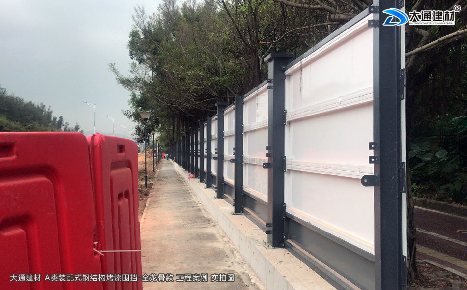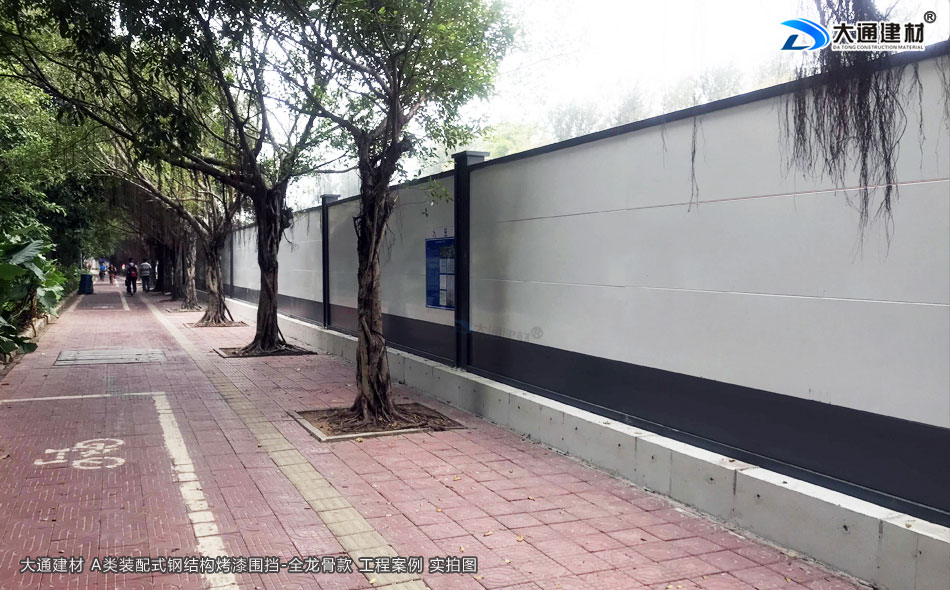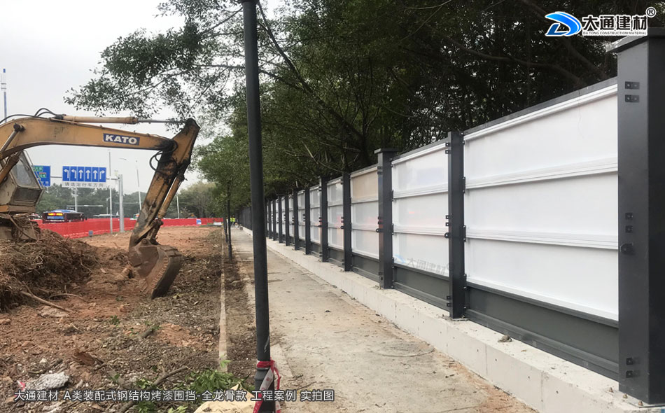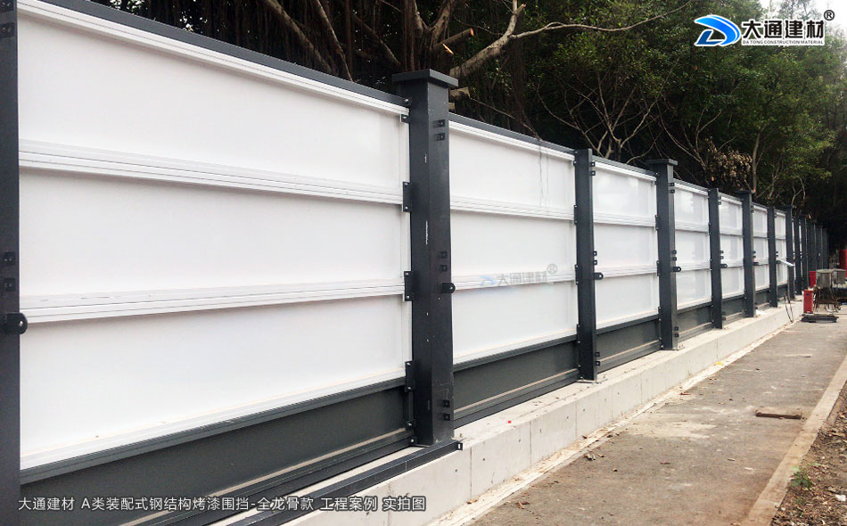 深圳市大通建材圍擋烤漆全龍骨A款是一款施工用防護隔離圍擋。大通建材圍擋A款采用鋼結構設計,安裝穩固,抗風力強力;裝配式,拆裝與運輸都很便捷;雙面烤漆鋼板,表面十分光滑,色調溫和美觀;不易銹蝕,可以很好地抵御強酸強堿的侵蝕,可循環使用。