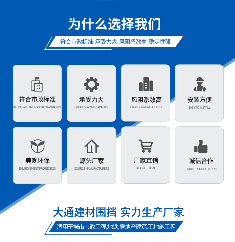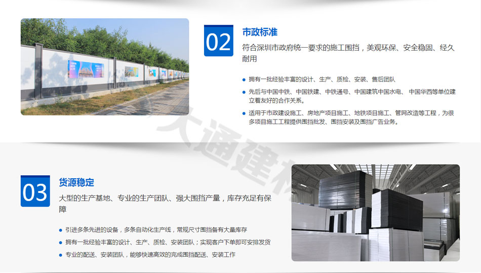 2019年,大通建材成為圍擋行業(yè)領(lǐng)先企業(yè),大通圍擋安全穩(wěn)固、美觀環(huán)保,適用于市政建設(shè)施工、房地產(chǎn)項目施工、隧道施工、地鐵項目施工、路橋維護施工、立面改造施工、廠房隔斷施工、管網(wǎng)改造等工程。